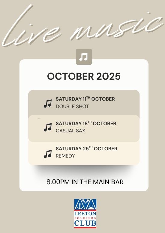 Join us in the Main Bar and unwind with a drink as talented musicians bring the vibes. Whether you’re catching up with mates or just looking for a fun night out, the Leeton Soldiers Club is the place to be for great music and good times.