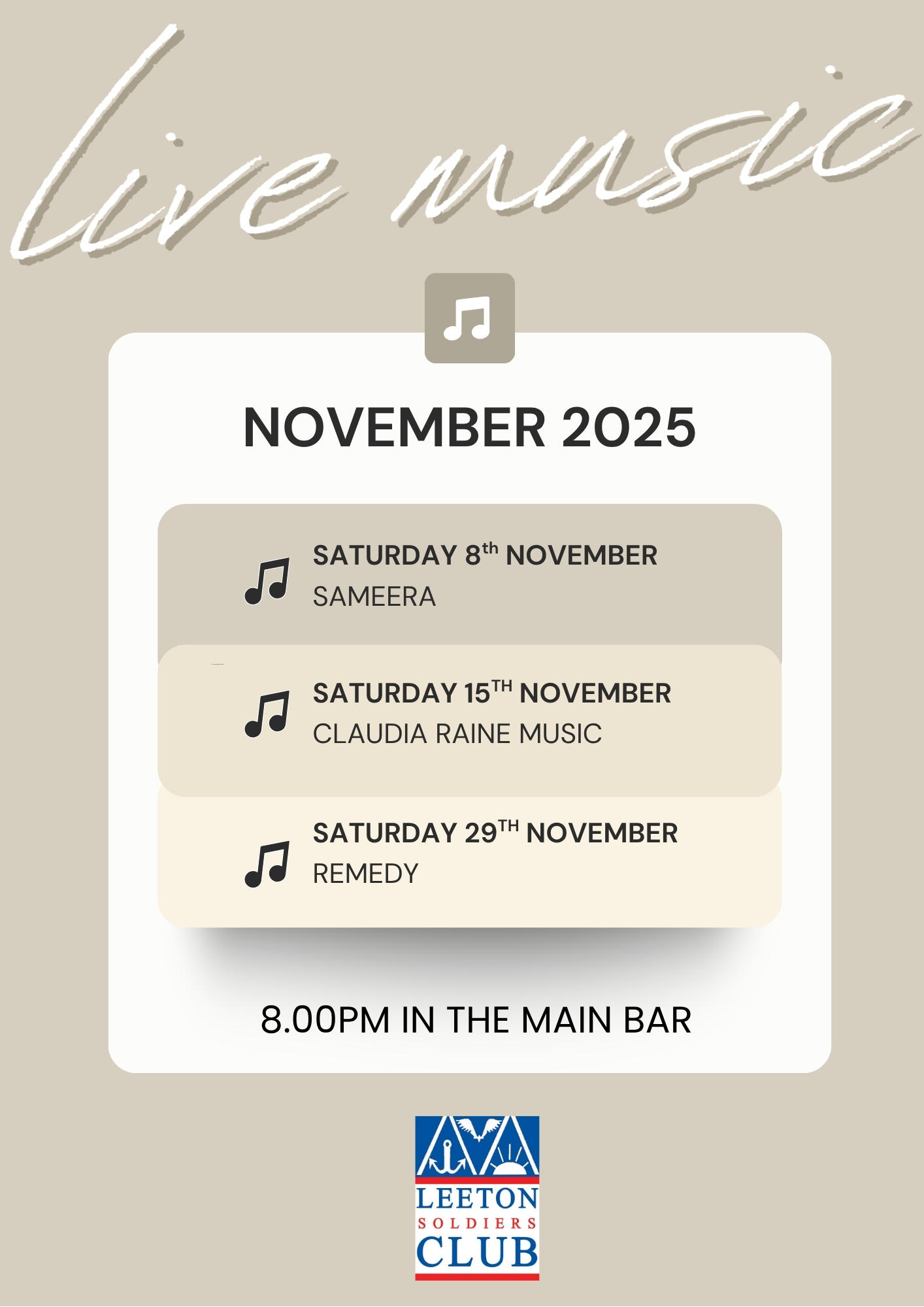 Upcoming Live Music – 8pm in the Main Bar